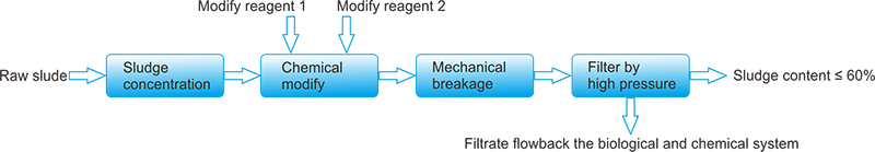 The moisture content of raw sludge can be reduced from 98%--99.5% to 95% by concentration, then put the sludge into sludge modification equipment. While add solid modified reagents in the equipment in proportion, making the reagent well contact with the sludge particlesthrough high-speed mixing. After mechanical wall-breaking effects by high shear emulsifying equipment, to make the intracellular fluid and adsorption water transfer to interstitial water, and ensure to improve sludge dewatering performance. Finally, the moisture content of sludge is less than 60% after dehydration with high pressure filter.