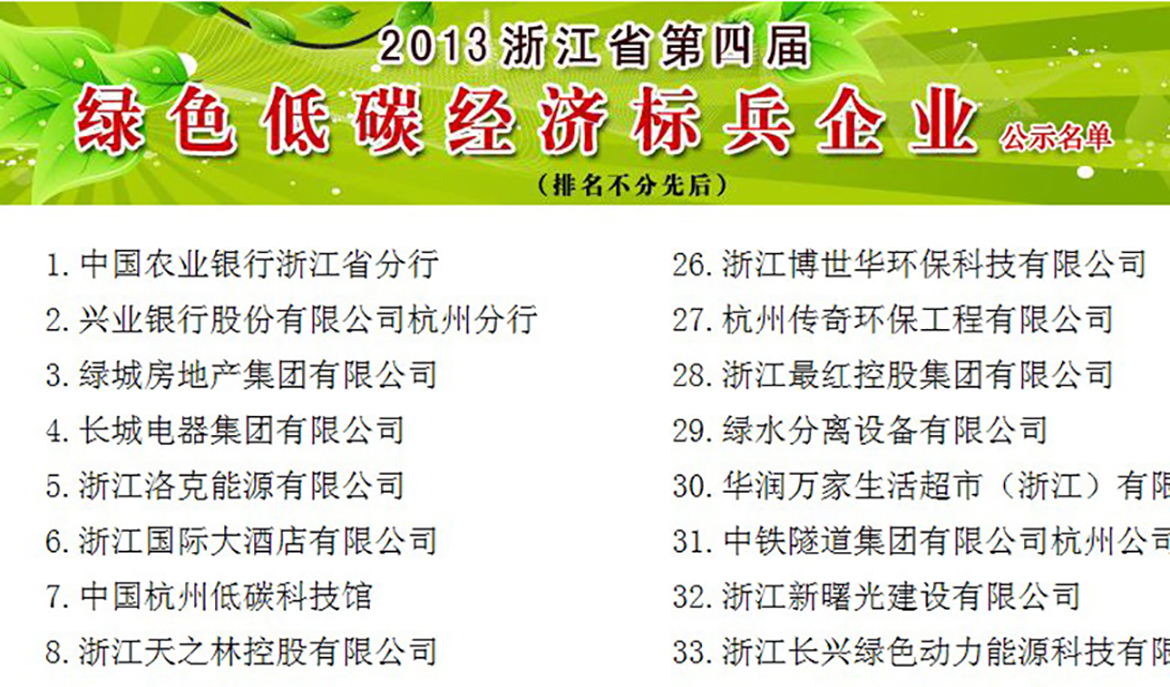 由錢江晚報、浙江在線新聞網(wǎng)站、浙江大學(xué)經(jīng)濟(jì)學(xué)院、浙江省企業(yè)發(fā)展研究會聯(lián)合主辦的浙江省第四屆“綠色低碳經(jīng)濟(jì)標(biāo)兵企業(yè)”評審會于2013年11月17日落幕,經(jīng)全體評委評審和無記名投票,在眾多入圍企業(yè)中選拔我省50家第四屆“綠色低碳經(jīng)濟(jì)標(biāo)兵企業(yè)”公示名單,我公司榮膺50家公示名單之內(nèi)。